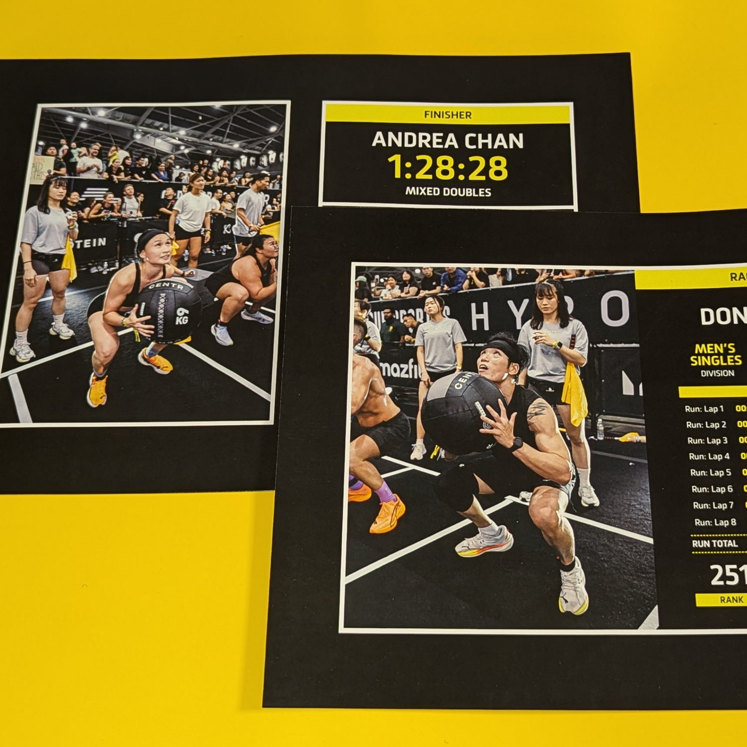 Each Finisher Frame is a standalone display for your HYROX finisher patch, individually put together and personalised with the details of your race: Name, ranking, the timing on your wall ball split—it's all there.